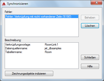 Das Dialogfeld Synchronisieren enthält eine Liste der festgestellten Fehler. Bestimmte Fehler (beispielsweise die Änderung der Größe einer Spalte in der Quelldatenbanktabelle) können direkt über das Dialogfeld Synchronisieren behoben werden. Andere Fehler, wie zum Beispiel Verknüpfungen, die auf nicht vorhandene Datensätze verweisen, müssen in der Quelldatenbanktabelle korrigiert werden.