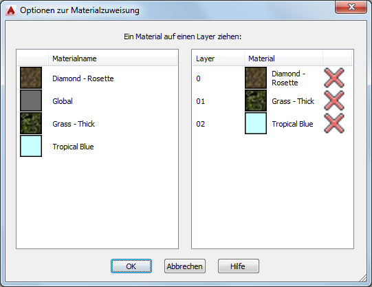 Listet alle Layer in der Zeichnung und in allen externen Referenzen auf, die der Zeichnung zugeordnet wurden. Die Miniaturansicht des Materials zeigt, welches Material dem Layer zugewiesen worden ist. Mit der Lösen-Schaltfläche (das X) heben Sie die Materialzuweisung zu dem Layer auf.