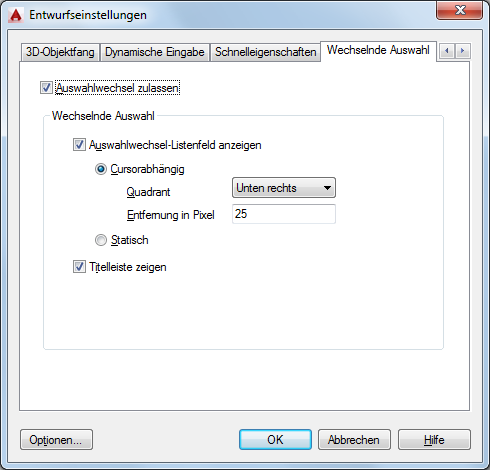 Steuert, ob die Funktion zum Wechseln der Auswahl aktiviert ist. SELECTIONCYCLING (Systemvariable)