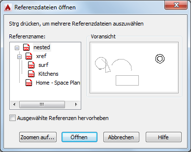 Das Dialogfeld Referenzdateien öffnen zeigt eine Baumstruktur mit allen verschachtelten XRefs an. Die Quelldatei für die ausgewählte XRef wird in einem separaten Fenster geöffnet, in dem Sie die Zeichnung bearbeiten, speichern und schließen können.