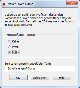 Standardmäßig wird die gesamte Geometrie des Schnittblocks auf Layer 0 (Null) positioniert. Sie können jedoch Präfix- oder Suffix-Beschriftungen festlegen, um das Ordnen der Block-Komponenten wie Schnittmengenbegrenzungen und -füllungen zu erleichtern. Beim Einfügen des Schnittbocks werden seine Komponenten auf neuen Layern positioniert, deren Namen sich aus dem Namen des Layers, der das Schnittobjekt enthält, und dem von Ihnen festgelegten Präfix oder Suffix zusammensetzen. Wenn die Schnittebene Objekte auf zwei oder mehr Layern enthält, werden zwei oder mehr neue Objektlayer erstellt.