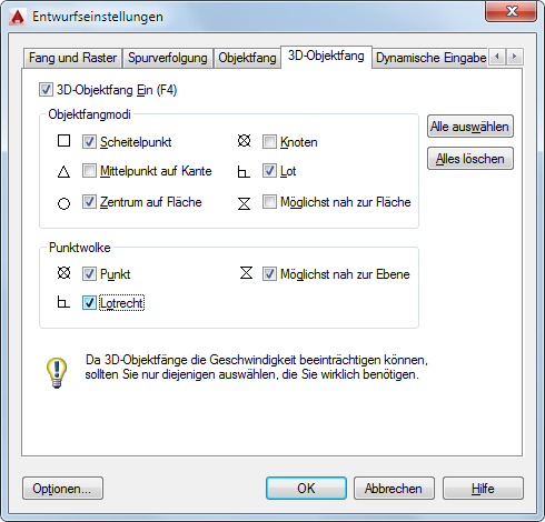 Steuert die aktuellen Einstellungen für den Objektfang für 3D-Objekte.