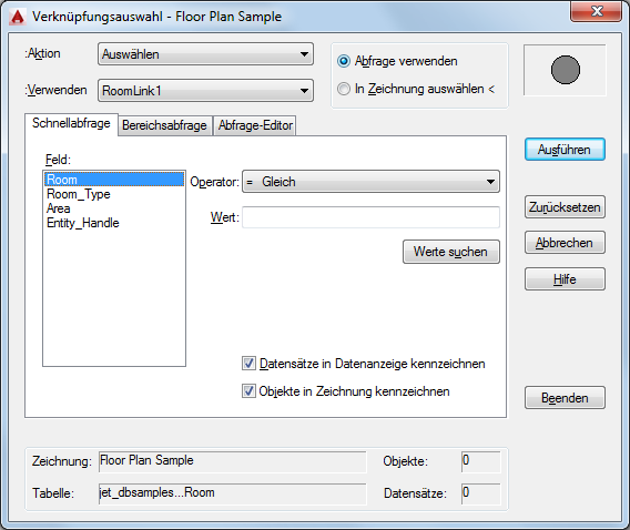 Führt die aktuelle Abfrage aus der Verknüpfungsauswahl aus oder schließt das Dialogfeld Verknüpfungsauswahl vorübergehend, sodass Sie grafische Objekte aus der Zeichnung auswählen können. Wenn die Option Abfrage verwenden aktiviert ist, wird die Schaltfläche Ausführen angezeigt. Wenn die Option In Zeichnung auswählen ausgewählt wurde, wird die Schaltfläche Auswählen angezeigt. Nach Auswahl der Schaltfläche Ausführen oder Auswählen können Sie weitere Abfragen anwenden oder zusätzliche grafische Objekte in den Auswahlsatz aufnehmen.