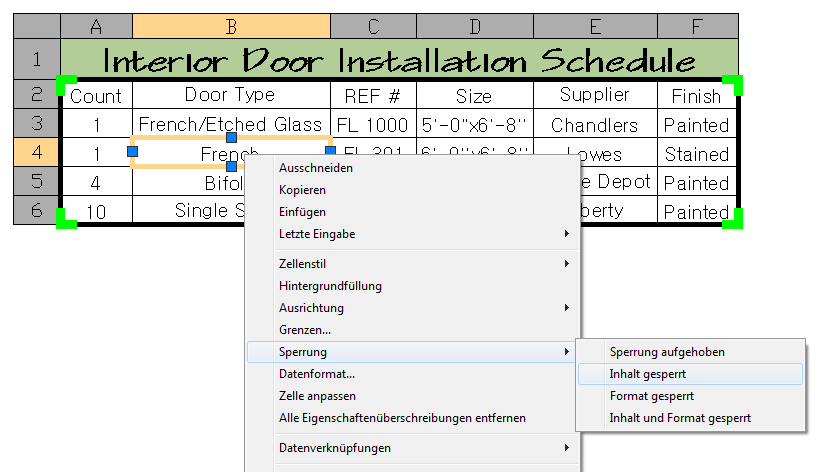 In der Vorgabe sind alle Zellen in einer Datenextraktionstabelle für die Bearbeitung gesperrt und für Formatierungsänderungen freigegeben. Sie können Zellen für Daten- und Formatierungsbearbeitungen im Kontextmenü der Tabelle sperren und freigeben.