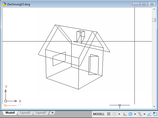 Wenn die perspektivische Ansicht aktiviert ist, passt Zoom die Brennweite des Objektivs an. Dadurch ändert sich das Blickfeld und die Größe des sichtbaren Teils der Zeichnung bei einem bestimmten Kamera-Ziel-Abstand. Die vorgegebene Brennweite ist 50 mm. Sie simuliert eine 35 mm-Kamera und ein 50 mm-Objektiv. Eine Erhöhung der Brennweite hat den gleichen Effekt wie das Umschalten auf ein Teleobjektiv. Eine niedrige Brennweite erweitert das Sichtfeld wie bei einem Weitwinkelobjektiv.