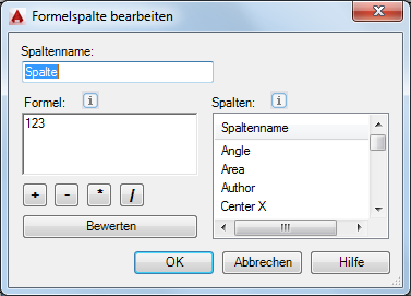 Zeigt die Spaltennamen der extrahierten Zeichnungsdaten und der externen Daten an (sofern eine Datenverknüpfung erstellt wurde). Spaltennamen können zum Feld Formel hinzugefügt werden, indem Sie auf den entsprechenden Namen doppelklicken. Alternativ können sie von der Liste Spalte auf das Feld Formel gezogen werden. Vorhandene Formelspalten werden nicht angezeigt und können nicht als Werte zum Erstellen weiterer Formelspalten verwendet werden.