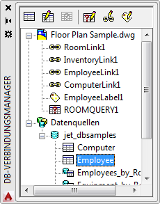 Enthält Knoten für die einzelnen geöffneten Zeichnungen sowie einen Datenquellenknoten mit den verfügbaren, im System konfigurierten Datenquellen.