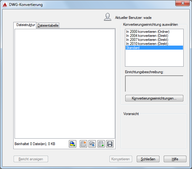 Zeigt eine Liste der Zeichnungsdateien, die Sie konvertieren möchten. Alle Dateien, die konvertiert werden sollen, werden durch ein Häkchen neben dem Dateinamen gekennzeichnet. Klicken Sie mit der rechten Maustaste in den Dateianzeigebereich, um ein Kontextmenü mit mehreren Optionen anzuzeigen.