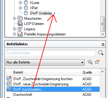- Ziehen Sie im Bereich Befehlsliste den Befehl, den Sie der Doppelklickaktion hinzufügen möchten, in den Bereich Anpassungen in <Dateiname>.