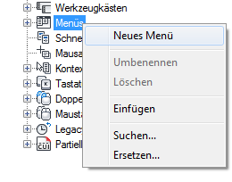 Klicken Sie auf der Registerkarte Anpassen im Bereich Anpassungen in <Dateiname> mit der rechten Maustaste auf den Knoten Menüs. Klicken Sie auf Neues Menü.