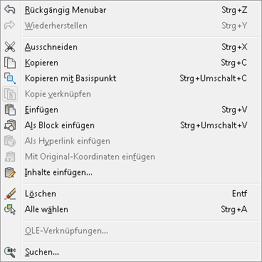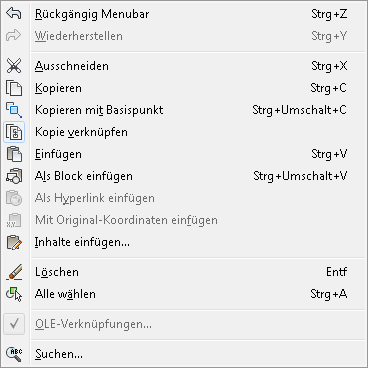 Das folgende Beispiel zeigt das Menüelement OLE-Verknüpfungen im Menü Bearbeiten, das durch ein Häkchen markiert ist, sowie das Bild des Menüelements Kopie verknüpfen, das durch einem Rand hervorgehoben ist.