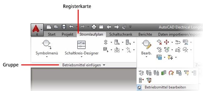 Schaltkreis-Designer ist Stromlaufplan der Name der Registerkarte, Betriebsmittel einfügen der Name der Gruppe auf der Registerkarte und Schaltkreis-Designer der Name des Befehls.