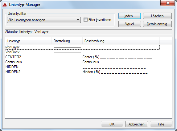 Zeigt die geladenen Linientypen in Abhängigkeit von der unter Linientypfilter gewählten Option an. Um schnell alle Linientypen auszuwählen oder zu löschen, klicken Sie mit der rechten Maustaste auf die Linientypliste, um das Kontextmenü anzuzeigen.