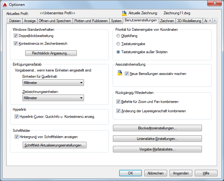 Öffnet das Dialogfeld Rechtsklick-Anpassung. In diesem Dialogfeld werden weitere Definitionen für die Option Kontextmenüs im Zeichenbereich angeboten. (Systemvariable SHORTCUTMENU)