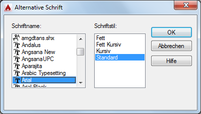 Wenn Sie keine alternative Schrift bestimmen, wird beim Öffnen von Zeichnungen, die nicht aufgefundene Schriften enthalten, ein Dialogfeld angezeigt, in dem Sie jeweils eine Schrift als Ersatz für die fehlenden Schriften festlegen können.