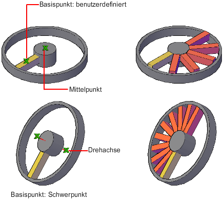 Wenn Sie eine Polaranordnung um einen Mittelpunkt erstellen, wird als Drehachse die Z-Achse des aktuellen BKS verwendet. Sie können die Drehachse durch Angabe von zwei Punkten neu definieren.