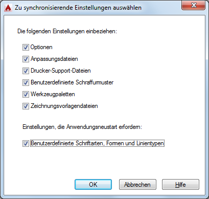 Gibt an, welche Einstellungen mit Autodesk 360 synchronisiert werden.