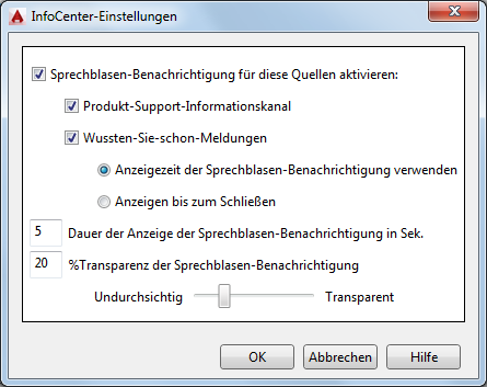 Bietet Optionen zum Steuern des Inhalts und der Anzeigedauer von Sprechblasen-Benachrichtigungen, die in der oberen rechten Ecke des Anwendungsfensters angezeigt werden.