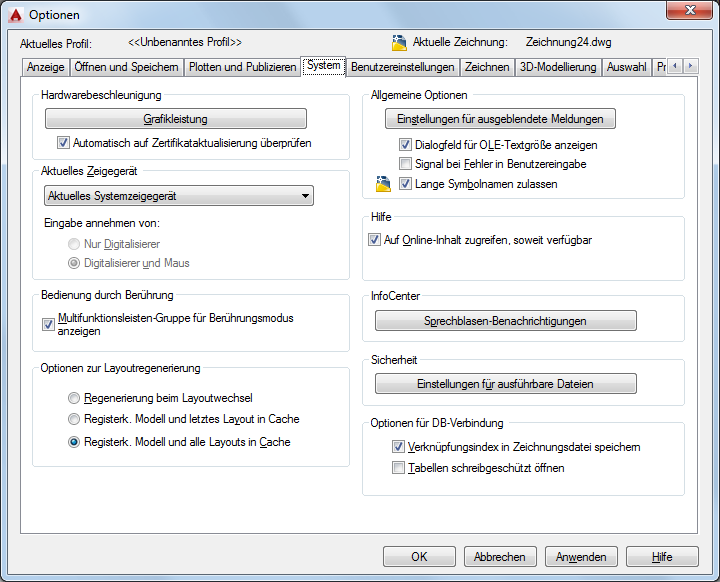 Für die Aktualisierung der Anzeigeliste auf den Registerkarten gibt es zwei Möglichkeiten: Entweder wird beim Aufrufen der Registerkarte die gesamte Zeichnung neu generiert, oder es werden nur die geänderten Objekte neu generiert. Durch das Ändern dieser Einstellungen kann die Leistung verbessert werden. (Systemvariable LAYOUTREGENCTL)