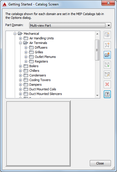 Wenn Sie das Dienstprogramm für die Inhaltsblock-Erstellung starten, wird das Dialogfeld Erste Schritte - Katalog geöffnet. Dieses aufgabenspezifische Dialogfeld funktioniert als Schaltstelle für den schnellen Zugriff auf die verschiedenen Arbeitsumgebungen. Das Dialogfeld Erste Schritte - Katalog enthält einen Bauteilkatalog-Browser und eine Symbolleiste. Sie wählen einen Katalog in der Liste der geladenen Bauteilkataloge aus, die im Dialogfeld Optionen auf der Registerkarte MEP-Kataloge festgelegt wurden. Weitere Informationen über Bauteilkataloge und die Art, wie Bauteile im Katalog gespeichert werden, finden Sie unter "Grundlegendes zu Teilekatalogen".