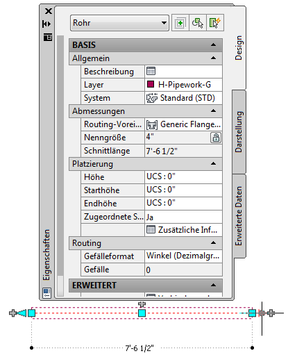 Die Länge eines Rohrsegments wird durch separate Verbindungen genau dargestellt. Die Schnittlänge auf der Eigenschaftenpalette ist die tatsächliche Länge des Rohrs und enthält Tiefen zum Einrasten der Flansche.