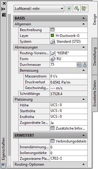 Ändern Sie die grundlegenden Eigenschaften eines Luftkanals/-rohrs mithilfe der Eigenschaftenpalette.
