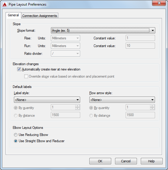 Im Dialogfeld Rohr-Layout-Voreinstellungen werden auf der Registerkarte Allgemein die Rohr-Layout-Voreinstellungen für Gefälle, Höhe, Beschriftungen und Fließrichtungspfeile gesteuert.
