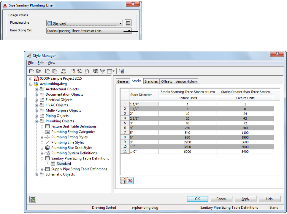Wenn Sie die Sanitärstrecke als Stapel für höchstens drei Stockwerke definieren, führt das Sanitärmodul die Größenberechnungen anhand der Daten auf der Registerkarte Stapel der Sanitärlinien-Bemessungstabelle (Rohrbemessungstabelle) aus, deren Definitionen im Stil-Manager zu finden sind.