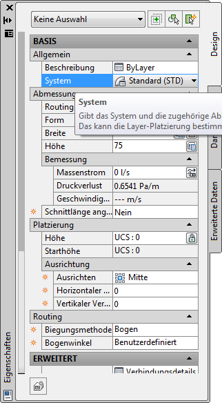 | Routing-Voreinstellung | Wählt eine Routing-Voreinstellung für das Luftkanal/-rohr-Objekt in der aktuellen Zeichnung aus | Standard (Standardeinstellung); Optionen aus dem Katalog |