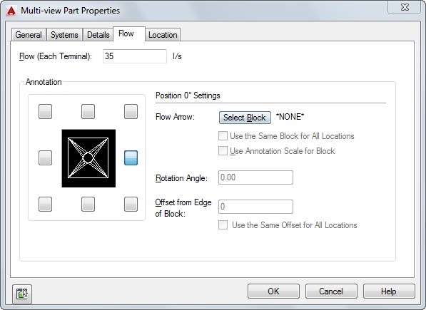 Bis zu acht Positionen für Fließrichtungspfeile am Luftauslass können angegeben werden. Es ist möglich, den Block für den Fließrichtungspfeil auszuwählen und optional denselben Block für alle Fließrichtungspfeile zu verwenden oder verschiedene Blöcke je nach Position auswählen. Sie können den Drehwinkel und den Abstand zum Luftauslass für jeden Fließrichtungspfeil und einen Wert für den Fluss angeben.