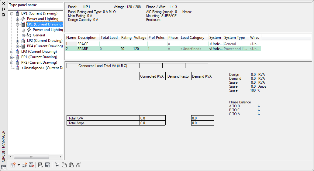 Der Schaltkreis-Manager zeigt die Schaltkreise an, die in der Zeichnung und in der Projektdatenbank definiert sind. Schaltkreise werden nach Schalttafeln und Systemtyp sortiert (siehe folgende Abbildung).