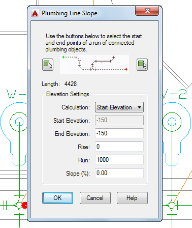 Anmerkung: Das Gefälle und die Höhe von verbundenen Abzweiglinien oder MV-Bauteilen ändern sich nicht, wenn Sie das Gefälle einer Sanitärlinie ändern. Die verbundenen Elemente bleiben mit der geänderten Sanitärlinie verbunden.