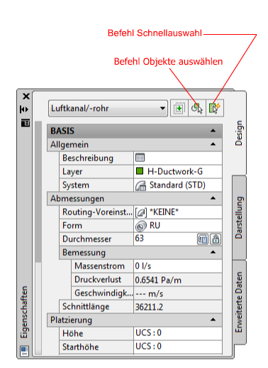 Beispiel auf der Luftkanal/-rohr-Eigenschaftenpalette