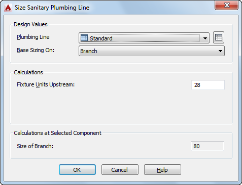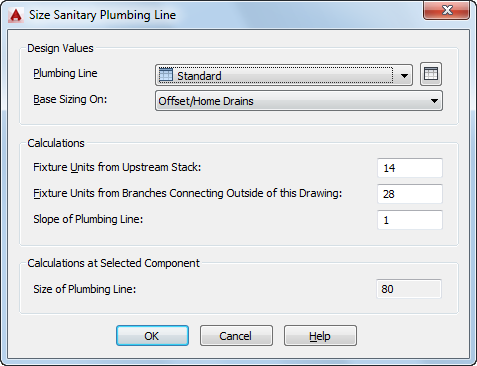 - Geben Sie das Ergebnis für Sanitärobjekte von außerhalb dieser Zeichnung verbundenen Abzweigen ein. Die ausgewählte Strecke erhält die entsprechende Größe und der Wert für Größe der Sanitärlinie wird entsprechend aktualisiert.