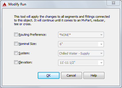 Dieses Dialogfeld zeigt die aktuellen Einstellungen für das ausgewählte Objekt an. Die vorgenommenen Änderungen wirken sich auf ähnliche Objekte in der Rohrstrecke bis zu einem MV-Bauteil, einer Reduzierung, einem T-Stück oder Kreuzstück aus.