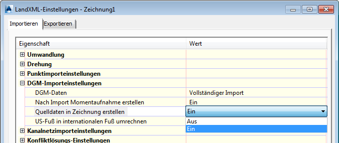 Abbildung 2: LandXML-Einstellungen für den DGM-Import