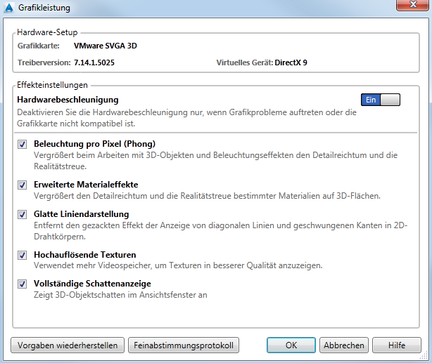 Außerdem können Sie durch Eingabe des Befehls -GRAFIKKONFIG in der Befehlszeile auf weitere Optionen zugreifen. Weitere Informationen erhalten Sie in der AutoCAD-Hilfe.