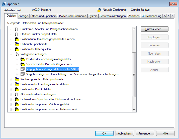 Wenn Sie AutoCAD Civil 3D mit dem britischen Profil starten, ist die Standardvorlage für eine neue Zeichnung _AutoCAD Civil 3D (Imperial) NCS.dwt. Wenn Sie AutoCAD Civil 3D mit dem metrischen Profil starten, ist die Standardvorlage für eine neue Zeichnung _AutoCAD Civil 3D (Metric) NCS.dwt. Die Standardvorlage wird angewendet, wenn Sie AutoCAD Civil 3D starten oder eine neue Zeichnung (Befehl SNEU) erstellen. Sie können jedoch eine andere Standardvorlage angeben, die Ihren Anforderungen besser entspricht.