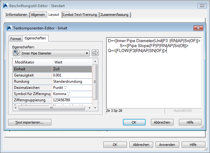 Der Haltungsradius (Pipe Radius) wurde durch den Ausdruck ((Start Crown Elevation – Start Invert Elevation)/2) ersetzt. Die Verwendung des Haltungsradius, einer benannten Komponente der Haltung, funktioniert in diesem Fall nicht fehlerfrei. Verwenden Sie auch nicht die Komponente {Inner Pipe Diameter}.