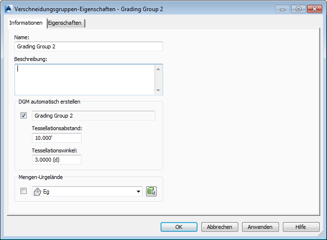 Um das Problem mit der Bogentriangulation zu beheben, müssen Sie für den Tessellationsabstand der Verschneidungsgruppe einen kleineren Wert festlegen. Wie in Abbildung 26 zu sehen ist, ist es möglicherweise schwierig, im Dialogfeld Verschneidungsgruppen-Eigenschaften das Feld für die Eingabe des Tessellationsabstands zu finden, da dieser Wert nur eingegeben werden kann, wenn die Option DGM automatisch erstellen aktiviert ist. Diese Einstellung wird jedoch auch für den Befehl Losgelöstes DGM erstellen sowie für die Triangulation der Flächenverschneidung verwendet. Die beste Lösung für diese Situation ist, die Option DGM automatisch erstellen zu aktivieren, den Standardwert für den Tessellationsabstand von 10 Fuß in 1 Fuß zu ändern und die Option DGM automatisch erstellen wieder zu deaktivieren. Nach dem Aktivieren der Option DGM automatisch erstellen müssen Sie auf Anwenden klicken, um die geänderten Einstellungen anzuwenden.