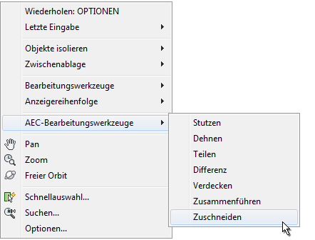 Bevor Sie Höhenlinienpolyliniendaten zu einem DGM hinzufügen, überlegen Sie, ob die Daten Gelände enthalten, die für die Konstruktionszwecke nicht erforderlich sind. In diesem Fall können Sie unerwünschte Bereiche der Höhenlinien mit den AEC-Bearbeitungswerkzeugen beschneiden. Wie in Abbildung 5 dargestellt, sind diese Werkzeuge im Kontextmenü verfügbar, wenn keine Objekte in der Zeichnung ausgewählt sind.