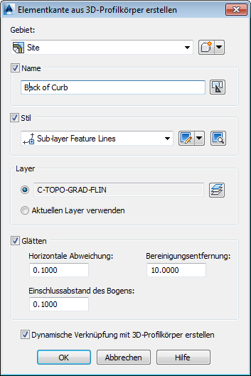Ein optimales Verfahren ist, im Dialogfeld Elementkante aus 3D-Profilkörper erstellen die Option Dynamische Verknüpfung zu aktivieren (siehe Abbildung 35), sodass in diesem Beispiel alle Aktualisierungen des 3D-Profilkörpers auch auf die Verschneidung in diesem Bereich angewendet werden. Außerdem sind Einstellungen zum Glätten vorhanden, um die Bildung der Elementkante um einen geschwungenen Bereich herum zu steuern. Weitere Informationen finden Sie unter Elementkantenglättung.