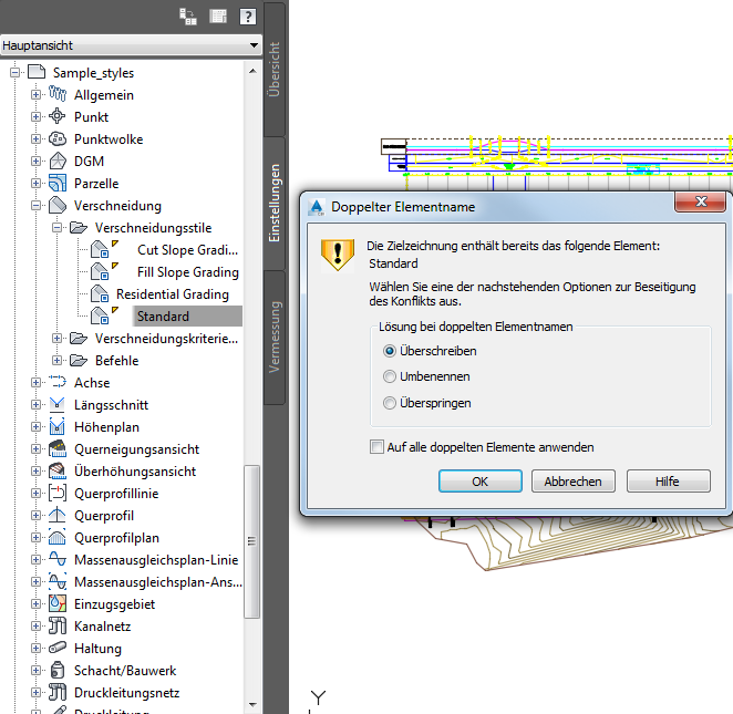 In dem nachfolgenden Beispiel in Abbildung 9 wurde in der Datei Sample_styles.dwg der Stil Grading Standard ausgewählt und auf den Namen der Datei Breaklines.dwg gezogen.