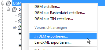 Sie können in AutoCAD Civil 3D DEM-Dateien aus einem DGM exportieren. Beim Export können Sie den Rasterabstand erhöhen, um die Datei zu verkleinern. In Abbildung 3 ist die Menüauswahl zum Starten des Exportvorgangs dargestellt.
