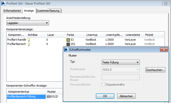 Beim Entwerfen von 3D-Profilkörpern können Sie effizientere Querschnittsbestandteile erstellen, wenn Sie sicherstellen, dass der Profilart-Stil ohne Füllung oder zumindest mit einer festen Füllung anstelle von Schraffurmustern definiert ist. Abbildung 2 zeigt das Dialogfeld Profilart-Stil, in dem Sie einen Profilart-Stil für einen Querschnittsbestandteil definieren können.