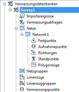 Auf dieser Registerkarte werden Vermessungsprojektdaten angezeigt, die in Datenbanken für Vermessungsprojekte, Geräte und Linienzugpräfixe organisiert sind. In den Projektdatenbanken werden die Vermessungspunkte, Netze und Linienzüge aufgezeichnet. In den Gerätedatenbanken werden Standardabweichungen und andere Funktionsparameter einzelner Teile von Vermessungsgeräten erfasst. In den Datenbanken für Linienzugpräfixe werden Konvertierungsroutinen gespeichert, die beim Erstellen von Parzellen, Gebäuden und anderen Linienzügen aus Vermessungspunkten angewendet werden.
