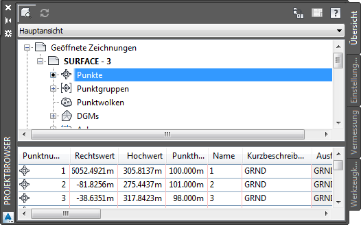 Auf der Registerkarte Vermessung können Sie Vermessungsprojekte, -daten und -einstellungen verwalten.