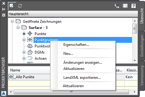 Der Projektbrowser ist eine wichtige Komponente zum Zugriff auf Befehle, Stile und Daten in der Benutzeroberfläche. Über den Projektbrowser können Sie auf die Registerkarten Übersicht, Einstellungen , Vermessung und Werkzeugkasten zugreifen. Klicken Sie mit der rechten Maustaste auf die einzelnen Sammlungen oder Elemente dieser Registerkarten, um die Befehle aufzurufen.