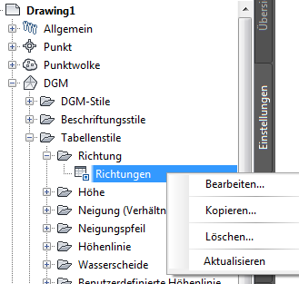 - Erweitern Sie im Projektbrowser auf der Registerkarte Einstellungen die Objektsammlung, erweitern Sie ggf. die Tabellenstiltypsammlung, klicken Sie mit der rechten Maustaste auf den Tabellenstilnamen, und klicken Sie auf .
