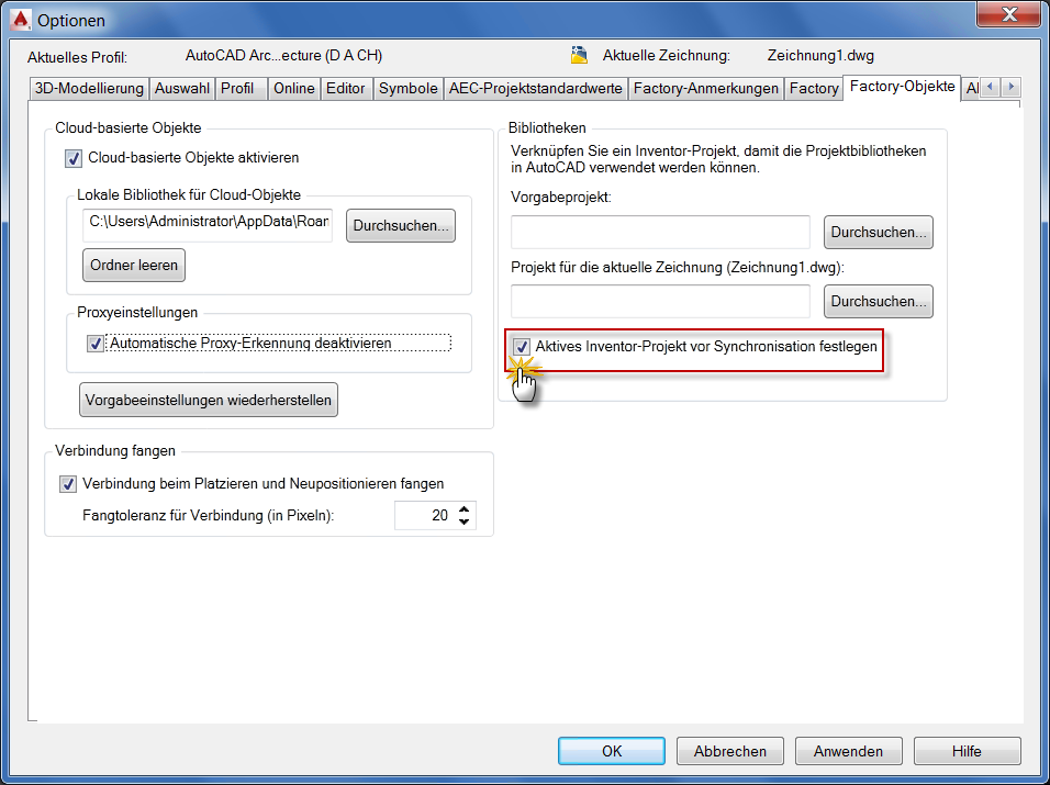 Beim Synchronisieren von AutoCAD mit Inventor dient die der DWG-Datei zugeordnete Projektdatei dazu, die aktuelle Projektdatei in Inventor festzulegen.